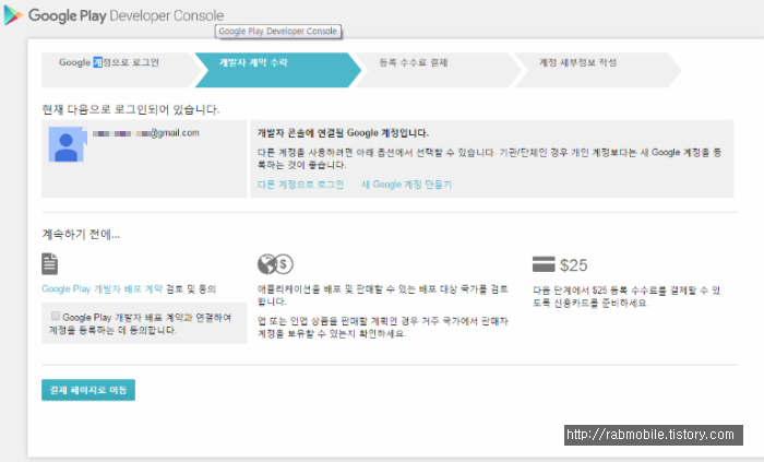 왼쪽 아래쪽으로 보시면 Google Play 개발자 배포계약 검토 및 동의 라는 곳에