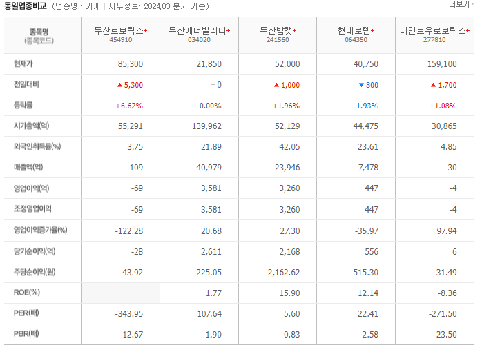 - 두산로보틱스의 매출액은 109억 원으로 상대적으로 작은 편이며, 이는 다른 기업들에 비해 낮은 수준입니다. 이는 기업의 크기와 시장 점유율에서 두산로보틱스가 상대적으로 작은 위치에 있음을 나타냅니다.
