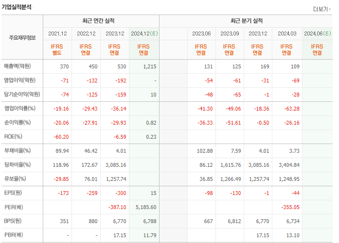 - PER이 -343.95로 매우 높은 음수를 나타내고 있습니다. 이는 시장에서 기업의 수익을 비관적으로 평가하고 있음을 의미합니다. 주가가 순이익에 비해 지나치게 높은 경우로 해석될 수 있습니다.
