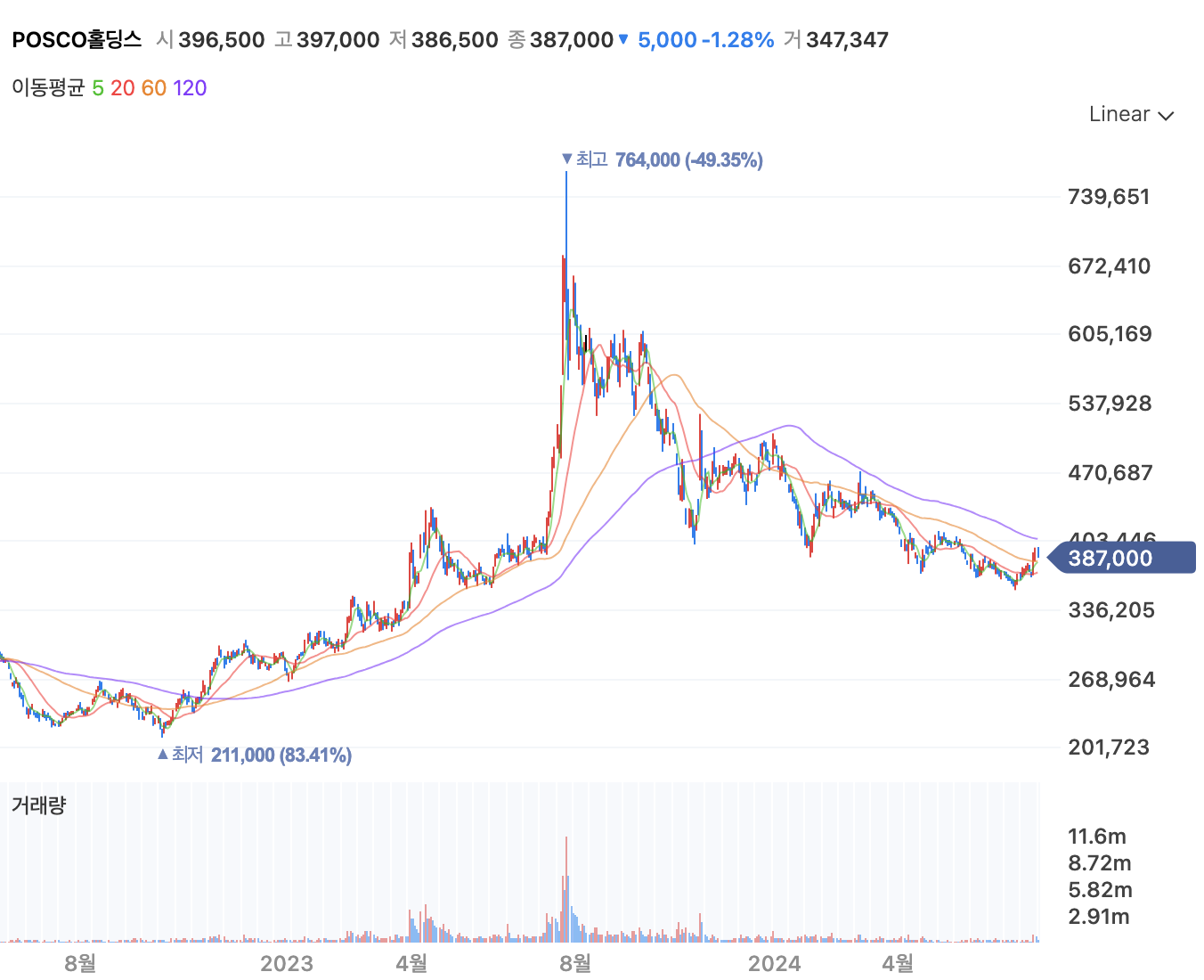 - POSCO홀딩스 주가는 현재 387,000원에 거래되고 있으며, 최근 1.28% 하락했습니다. 이 하락은 최근 단기 변동성의 일환으로 보입니다.