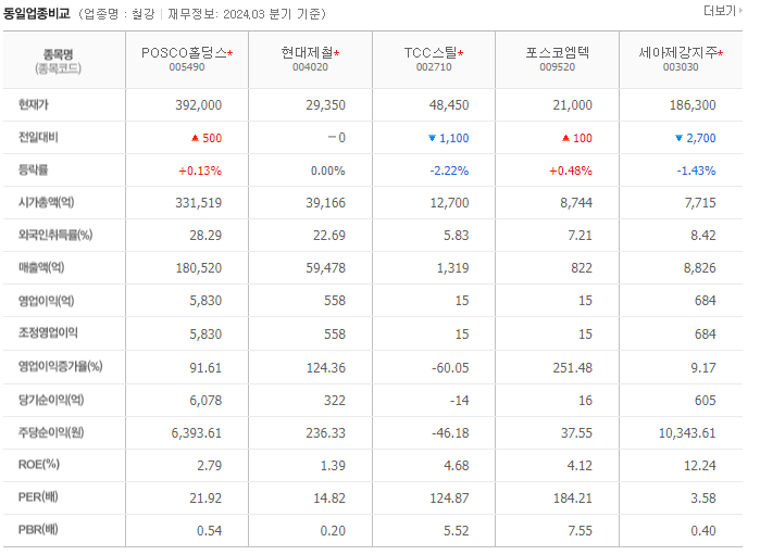 - POSCO홀딩스는 동종업계에서 가장 높은 매출액과 영업이익을 기록하고 있으며, 안정적인 재무 상태를 유지하고 있습니다. 경쟁사 대비 높은 시장 점유율과 기술력을 바탕으로 지속적인 성장 가능성이 큽니다.