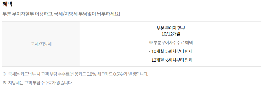 행사 내용 : 국세&지방세 5만원 이상 할부 결제 시 무이자(최대 4개월), 부분무이자(최대 10개월) 혜택