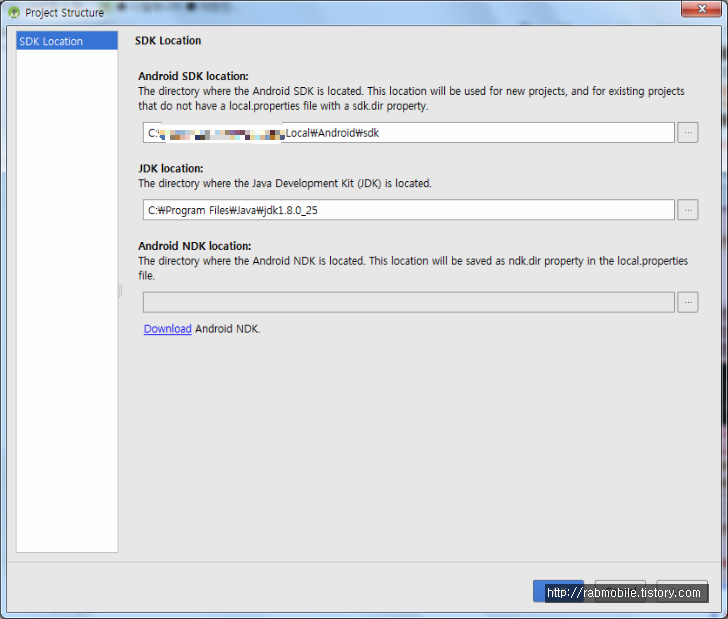5.SDK Location에서 본인의 SDK path 및 JDK path를 설정해주시면 끝!!