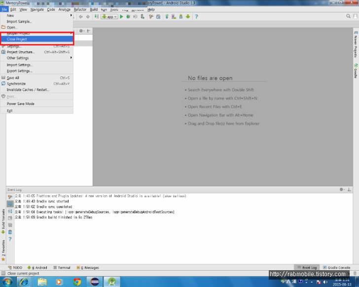 1. File - Close Project를 클릭하여 열려있는 프로젝트를 닫습니다.
