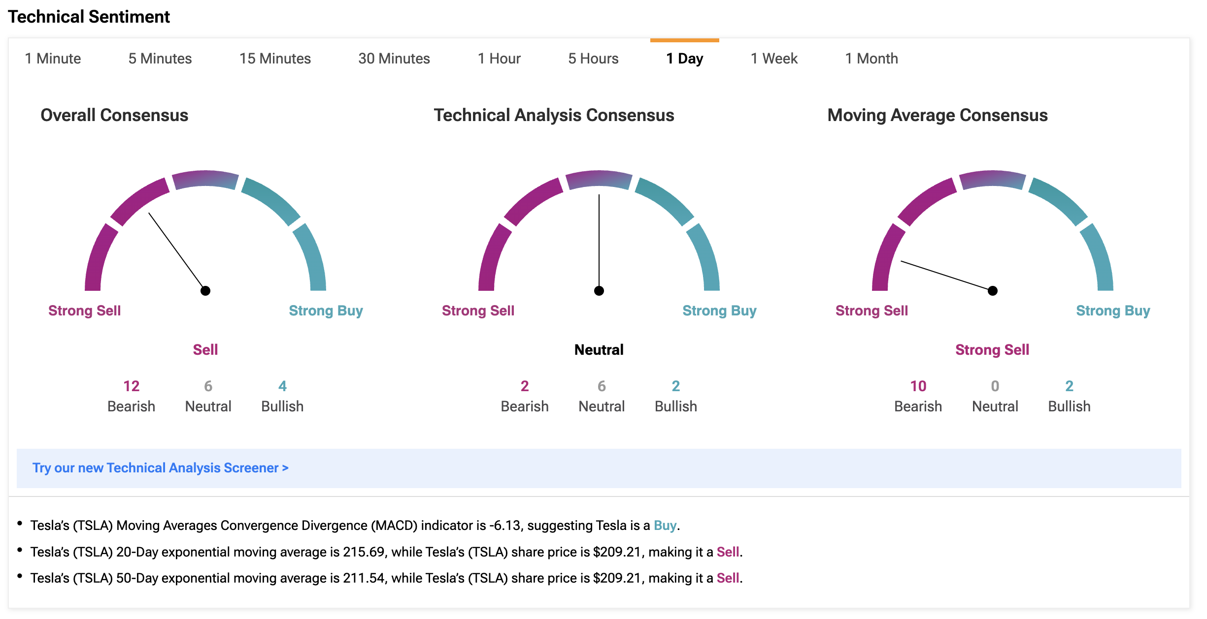 Tesla’s (TSLA) 50-Day exponential moving average is 211.54, while Tesla’s (TSLA) share price is $209.21, making it a Sell.