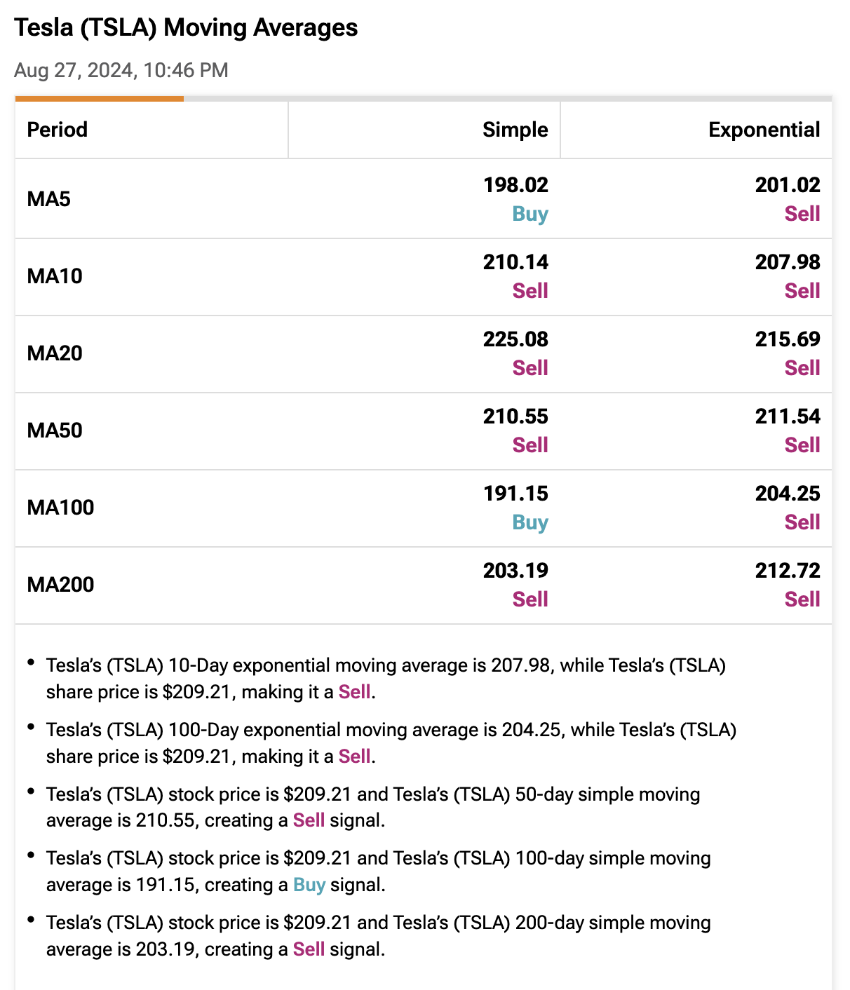 - Tesla의 50일 지수 이동 평균은 211.54달러로, 현재 주가인 209.21달러보다 높습니다.