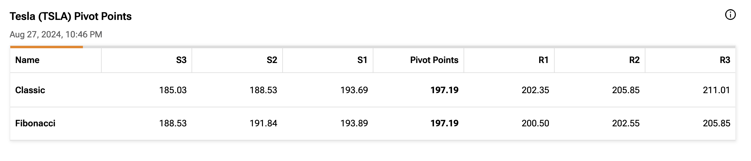 - 피봇 포인트 분석에서는 Tesla 주가가 피봇 포인트(197.19)보다 낮은 경우 추가적인 하락 가능성을 나타내며, 특히 지지선이 깨질 경우 하락세가 가속화될 수 있습니다.