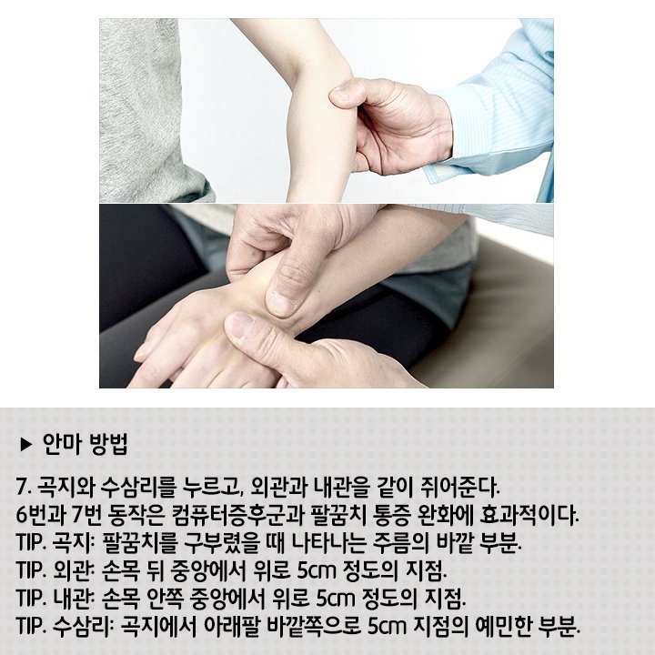 6번과 7번 동작은 컴퓨터증후군과 팔꿈치 통증 완화에 효과적이다