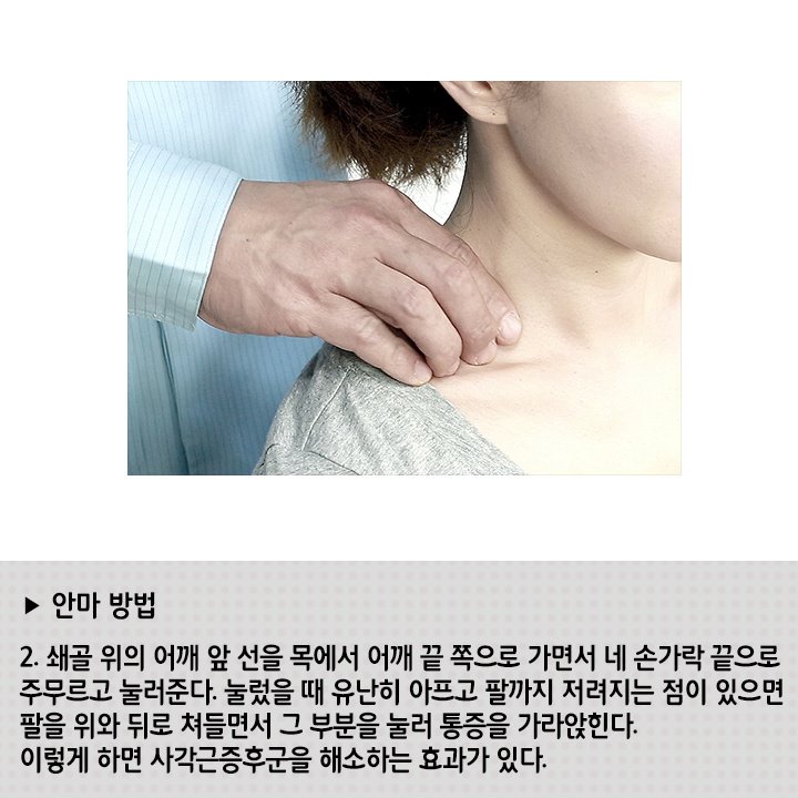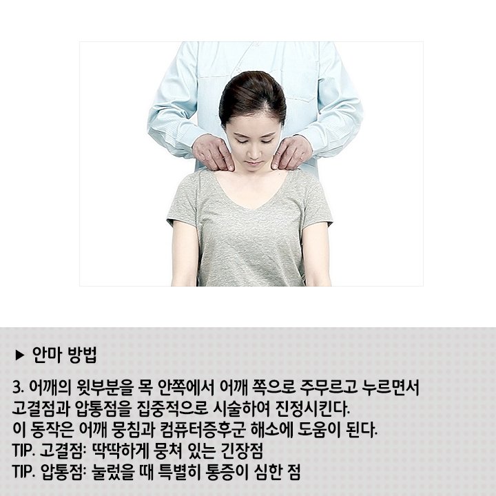 쇄골 위의 어깨 앞 선을 목에서 어깨 끝 쪽으로 가면서 네 손가락 끝으로 주무르고 눌러준다