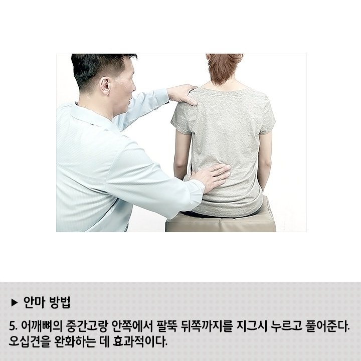 어깨뼈의 중간고랑 안쪽에서 팔뚝 뒤쪽까지를 지그시 누르고 풀어준다