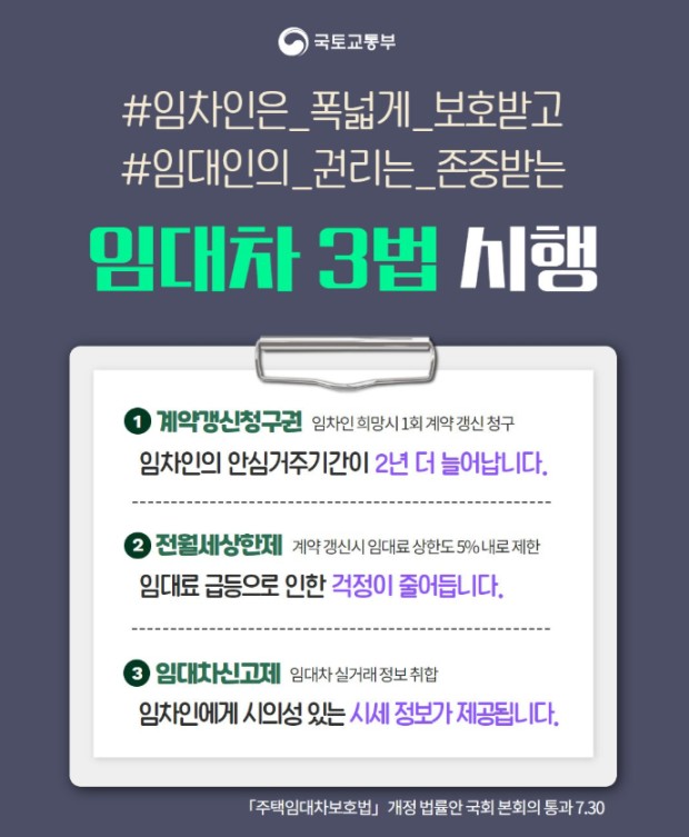먼저 임대차3법의 내용을 살펴보게 되면 전월세 상한제와 계약갱신청구권 그리고 전월세신고제에 대한 부분을 확인해 보실 수 있습니다.
