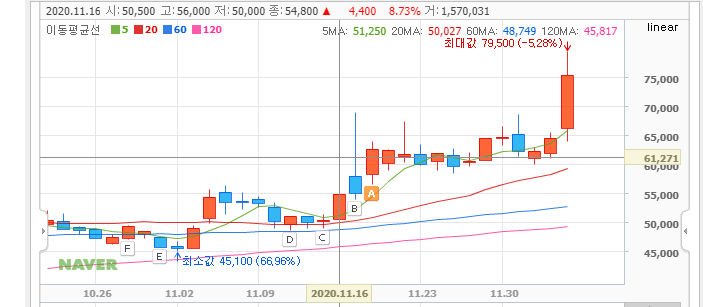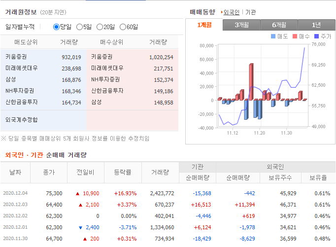 - 14시 이후 갑작스럽게 급등하여 16.93%(10,900원) 상승한 75,300원에 거래 마감