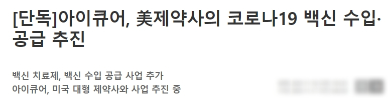 아이큐어의 백신공급 기사입니다.
