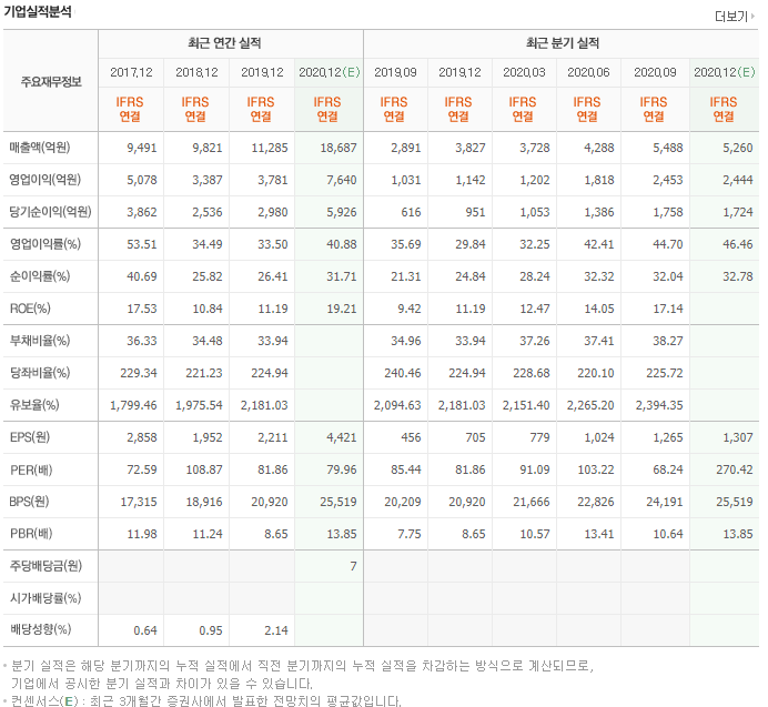 - 2020년 3분기 매출액 5,488억원, 영업이익 2,453억원, 당기순이익 1,758억원
