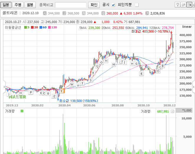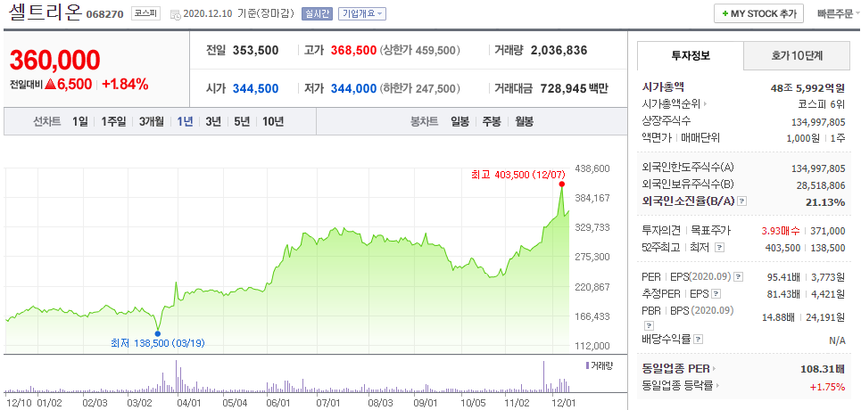 셀트리온 주가 (2020.12.10월 장 마감 기준)