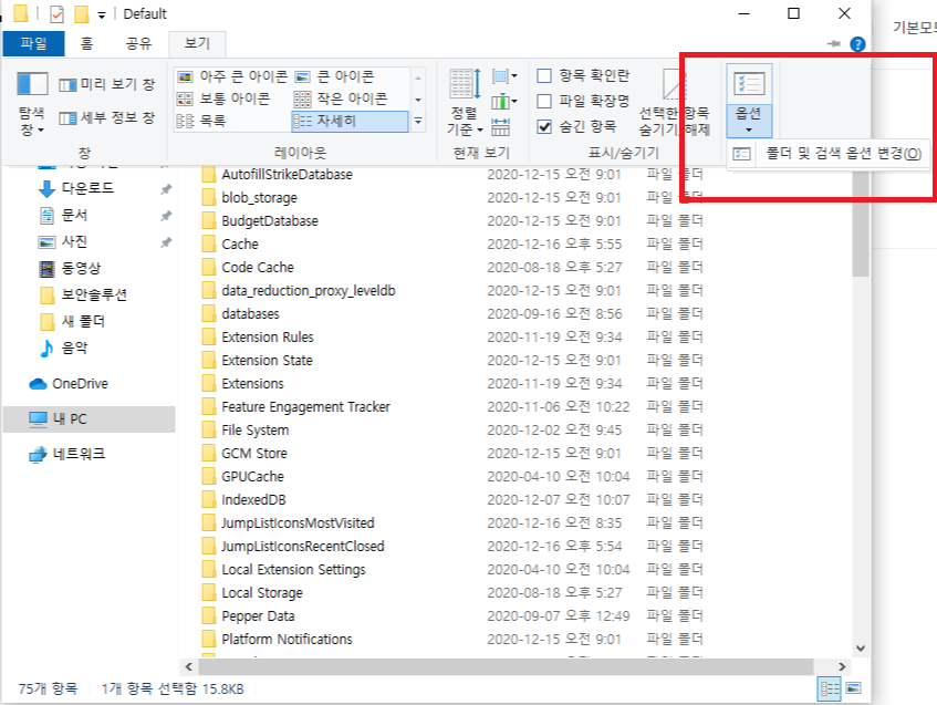 1. 폴더 - 보기 - 옵션 - 폴더 및 검색 옵션 변경
