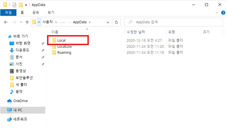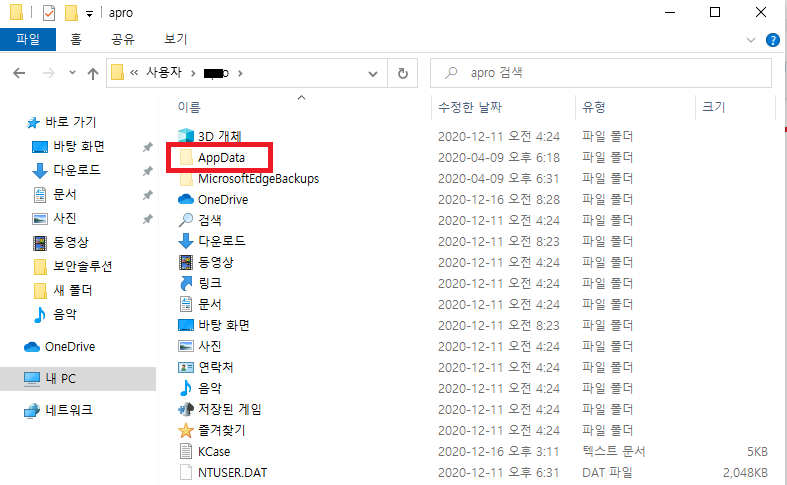 이렇게 폴더 안으로 들어오면 AppData라는 숨김 폴더가 보일 것입니다.