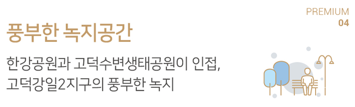 - 자연 : 한강공원과 고덕생태공원, 망월천, 고덕강일2지구의 풍부한 녹지를 가까이서 누리는 쾌적한 그린라이프