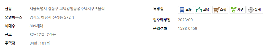 - 교통 : 5호선 하남선 연장(예정) 및 9호선 연장(예정), 올림픽대로·수도권 제1순환고속도로 인접으로 이동이 편리한 교통환경