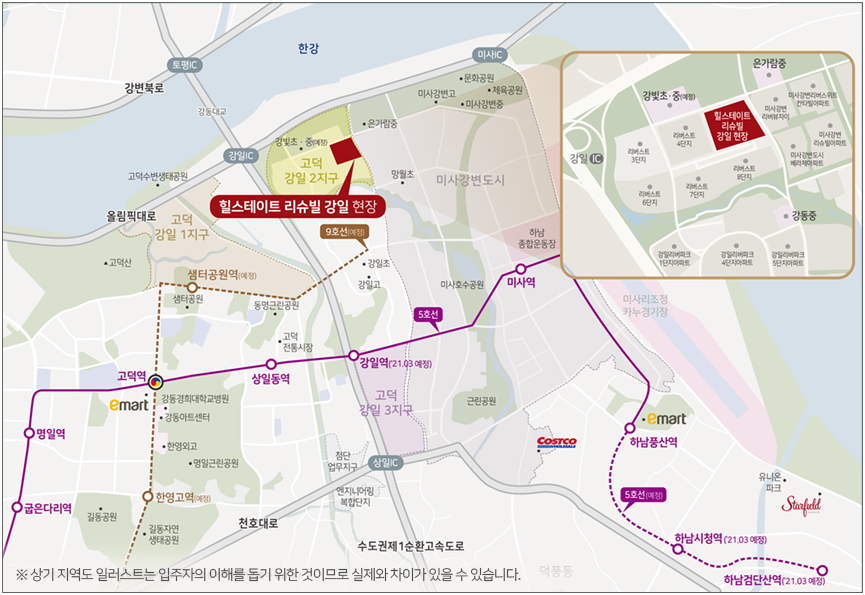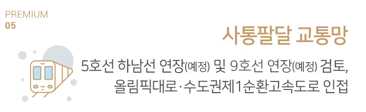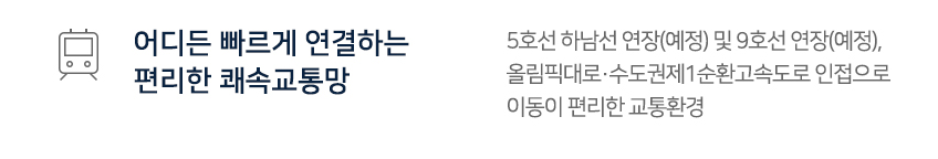 - 교통 : 5호선 하남선 연장(예정) 및 9호선 연장(예정), 올림픽대로·수도권 제1순환고속도로 인접으로 이동이 편리한 교통환경