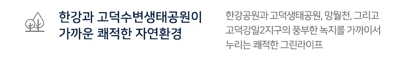 - 자연 : 한강공원과 고덕생태공원, 망월천, 고덕강일2지구의 풍부한 녹지를 가까이서 누리는 쾌적한 그린라이프