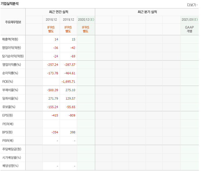 - 2020년도 매출액 33억 영업이익은 마이너스 예상