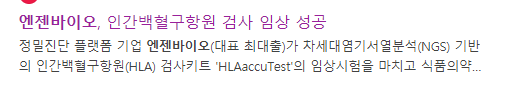- 차세대염기서열분석(NGS) 기반의 인간백혈구항원(HLA) 검사키트 'HLAaccuTest'의 임상시험을 마치고 식품의약품안전처에 체외진단의료기기 품목 허가 신청