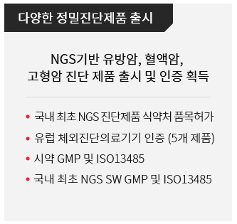 - 유전체 분야 연구개발, 시약제조, 소프트웨어 연구 개발 및 정밀진단 플랫폼 회사