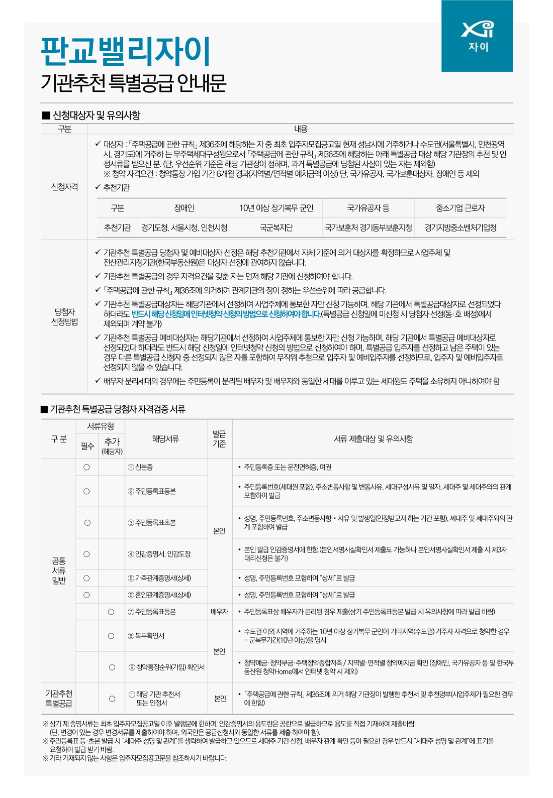 ● 판교밸리자이 기관추천 특별공급 안내문