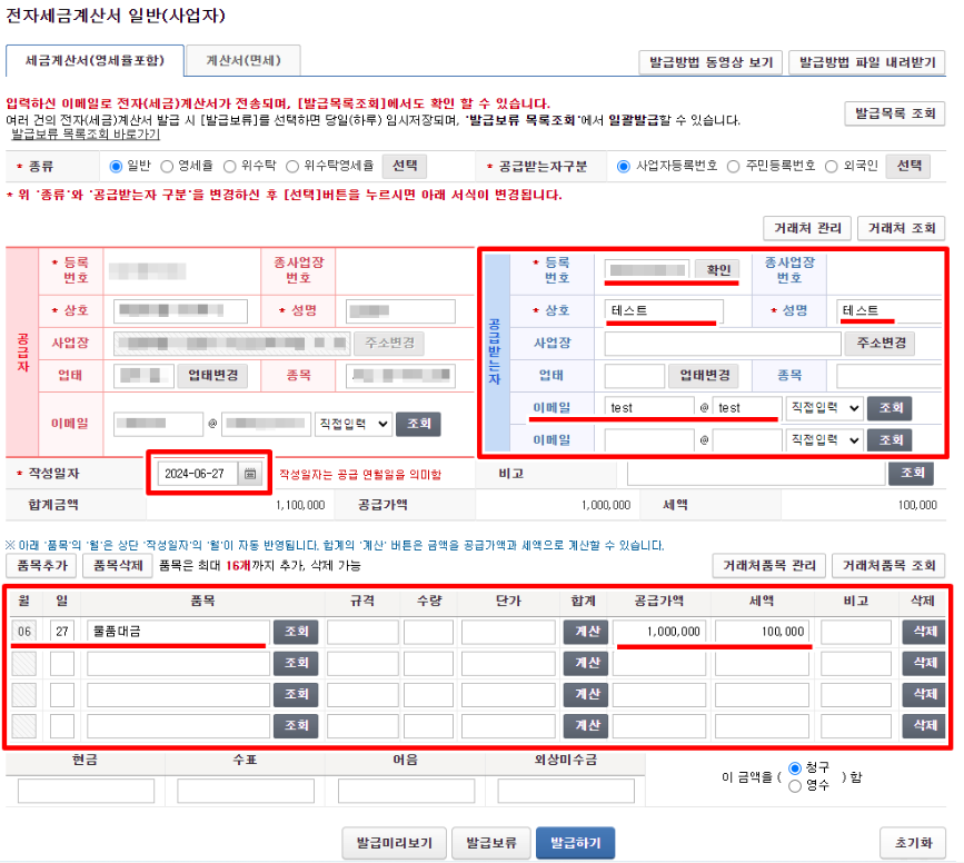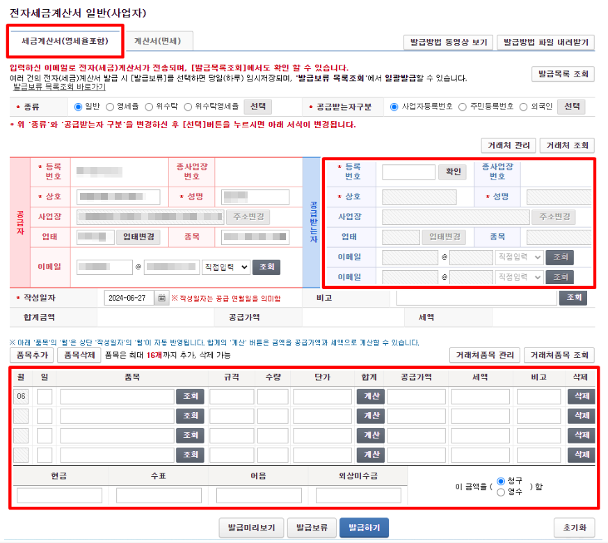 - 사업자 등록번호, 상호, 주소 등 공급자와 공급받는 자의 정보를 정확하게 입력해야 합니다.