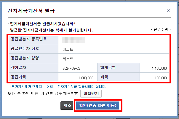 * 작성 된 내용이 맞으면 확인(인증 화면 이동)을 클릭합니다.