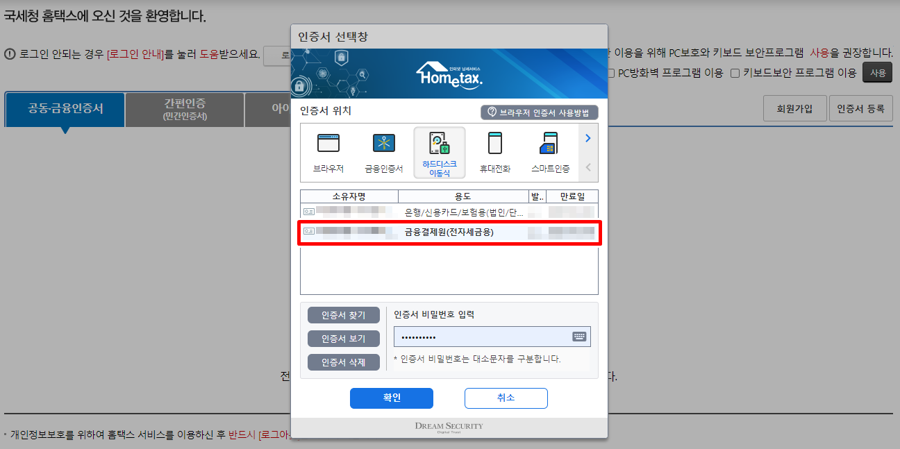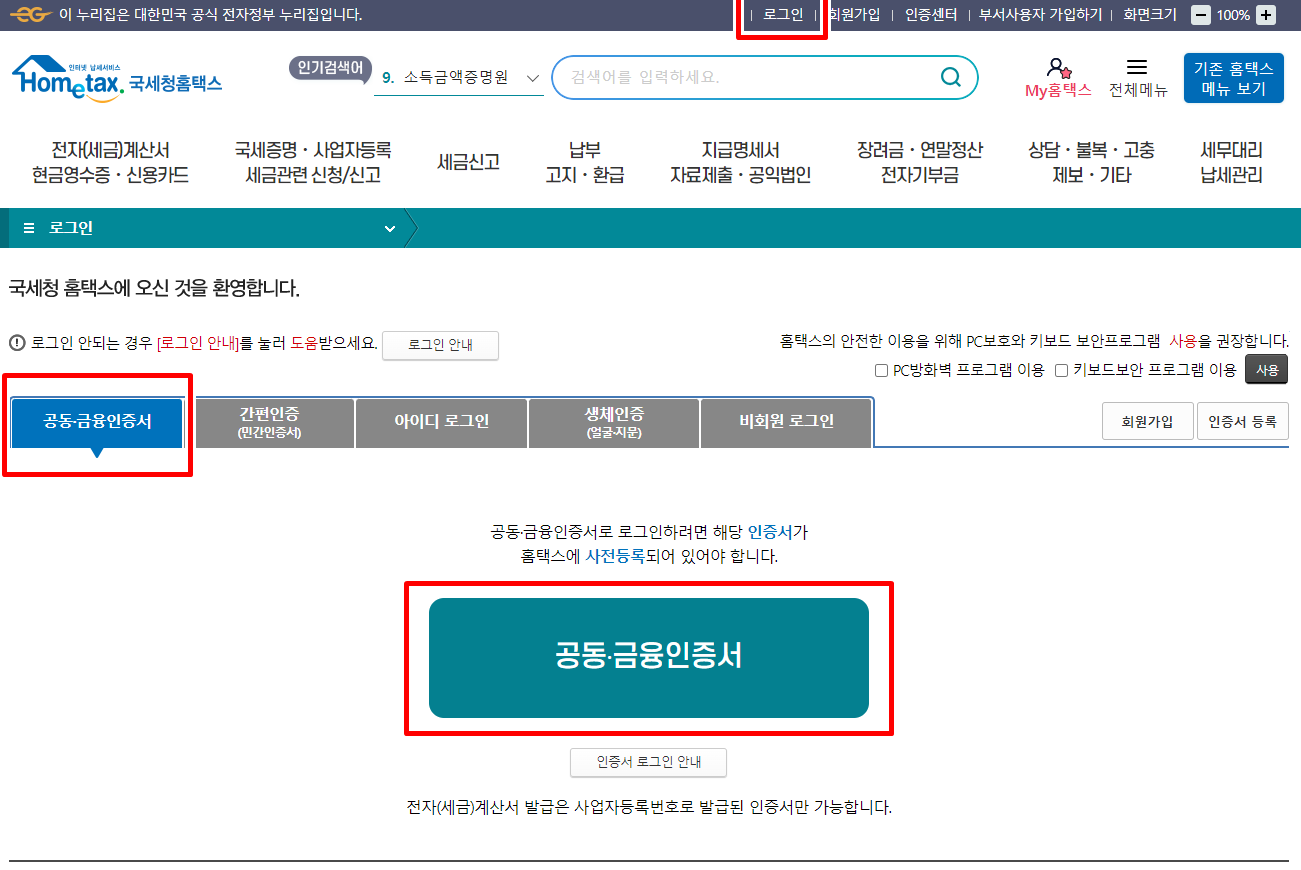 홈텍스 ▶ 로그인 ▶ 공동ㆍ금융인증서 클릭 합니다.