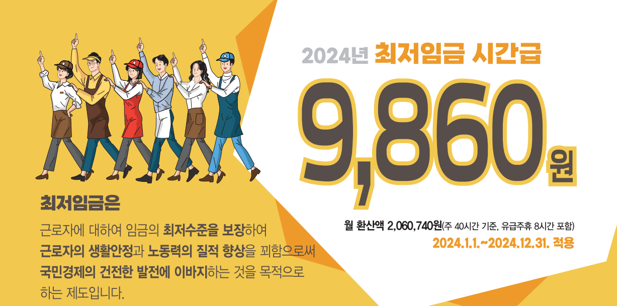 2024년 적용 최저임금이 시간당 9,860원으로 결정되었습니다.