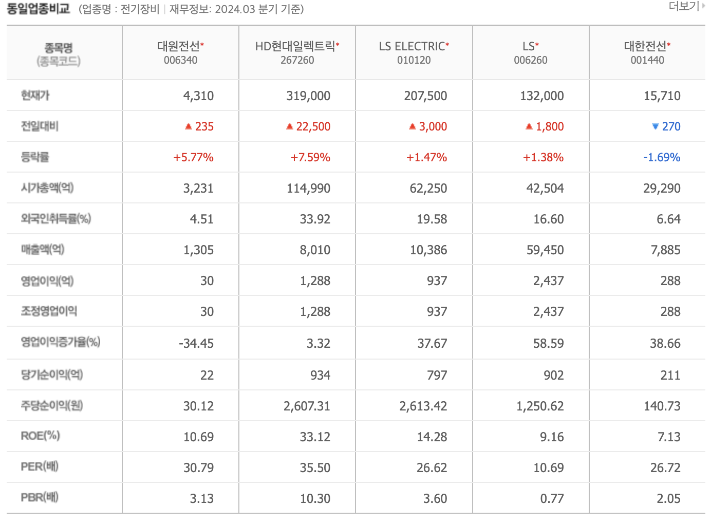 대원전선은 동일 업종 내에서 매출 및 이익 지표에서 비교적 안정적인 성과를 보이고 있으며, P/E 비율과 P/B 비율 측면에서도 경쟁력 있는 수준을 유지하고 있습니다. 이는 대원전선이 업계 내에서 안정적인 성장세를 유지하고 있음을 나타냅니다.