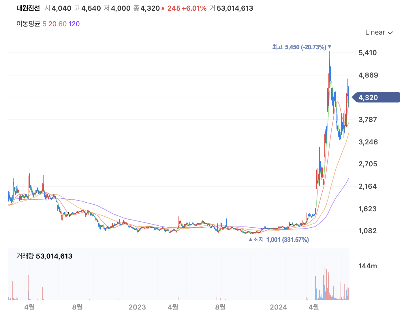 대원전선 주가는 최고가가 2024년 4월 4,500원이었으며, 최저가는 2023년 10월 2,800원이었습니다. 이 기간 동안 주가는 다양한 외부 요인과 회사 내부의 전략적 결정에 따라 변동했습니다.