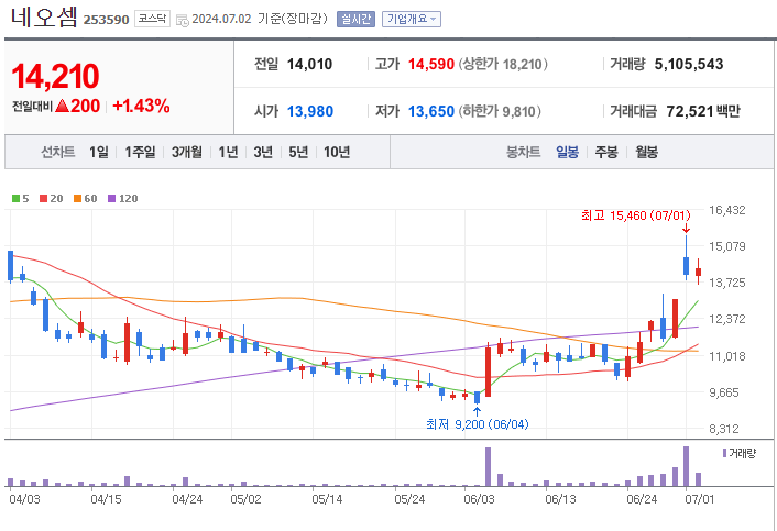 네오셈은 최고가는 2024년3월 17,150원이었으며, 최저가는 2023년5월 2,880원이었습니다.