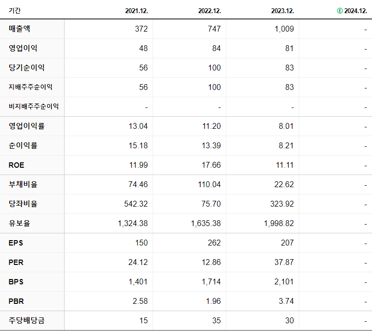 | ㆍ사업종류 : 특수목적용 기계 제조 ㆍ설립일자 : 2016.09.05 ㆍ상장일자 : 2018.04.04 ㆍ기업형태 : 중소기업, 코스닥상장 ㆍ소 재 지 : 경기도 안양시 동안구 시민대로327번길 12-26 ㆍ매 출 액 : 1,009억 3,122만 (2023.12.IFRS 연결) |