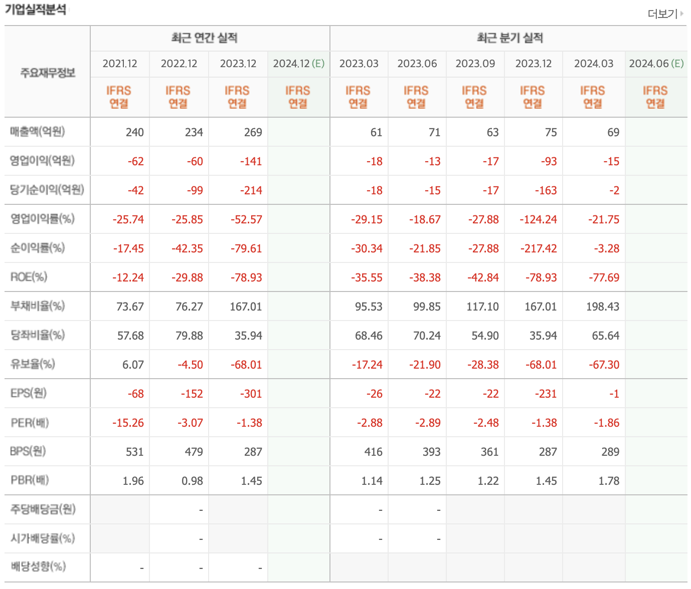 - EPS(주당순이익): 2021년 -68원, 2022년 -152원, 2023년 -301원