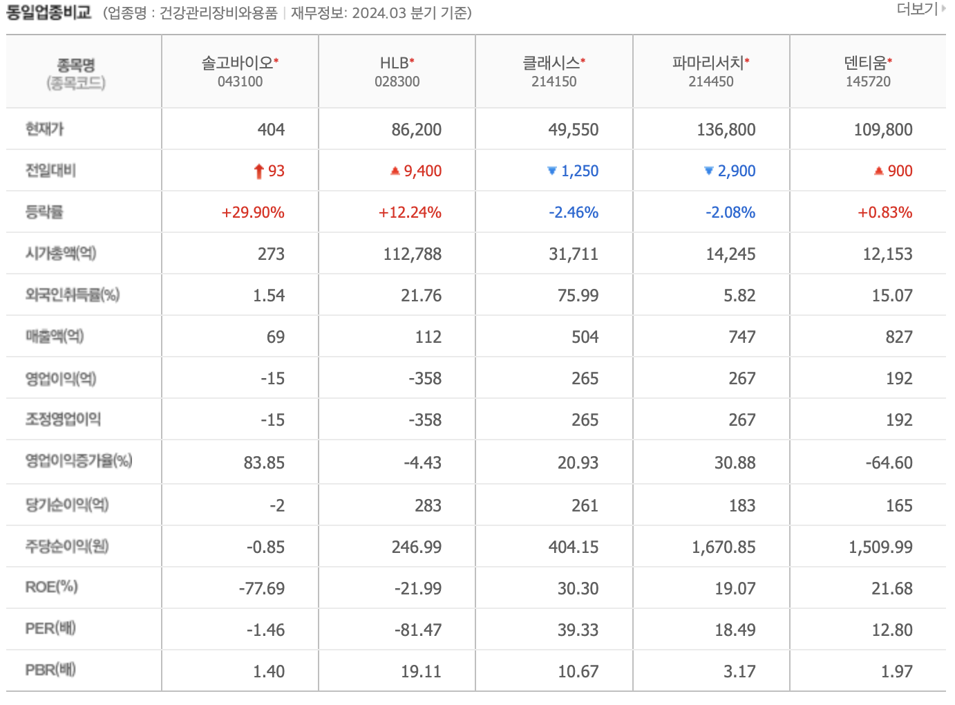 솔고바이오와 유사한 업종에 속한 기업으로는 HLB, 클래시스, 파마리서치, 덴티움 등이 있습니다. 이들 기업과의 비교를 통해 솔고바이오의 경쟁력을 평가해 보겠습니다.