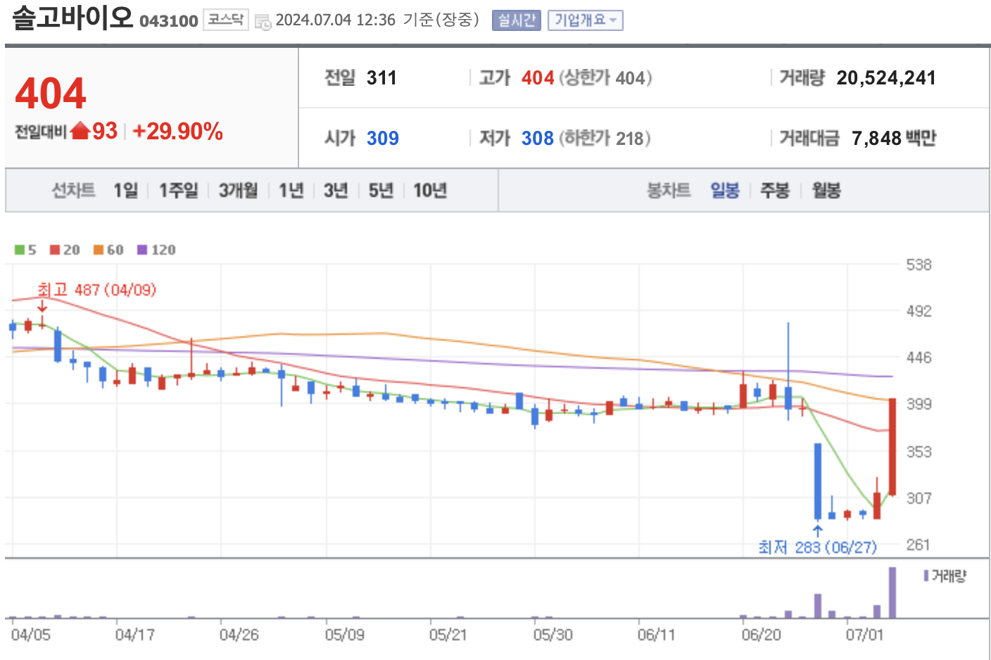 2024년 7월 4일 기준, 솔고바이오의 주가는 404원으로 전일 대비 29.90% 상승하며 상한가를 기록했습니다. 최근 주가는 다음과 같습니다: