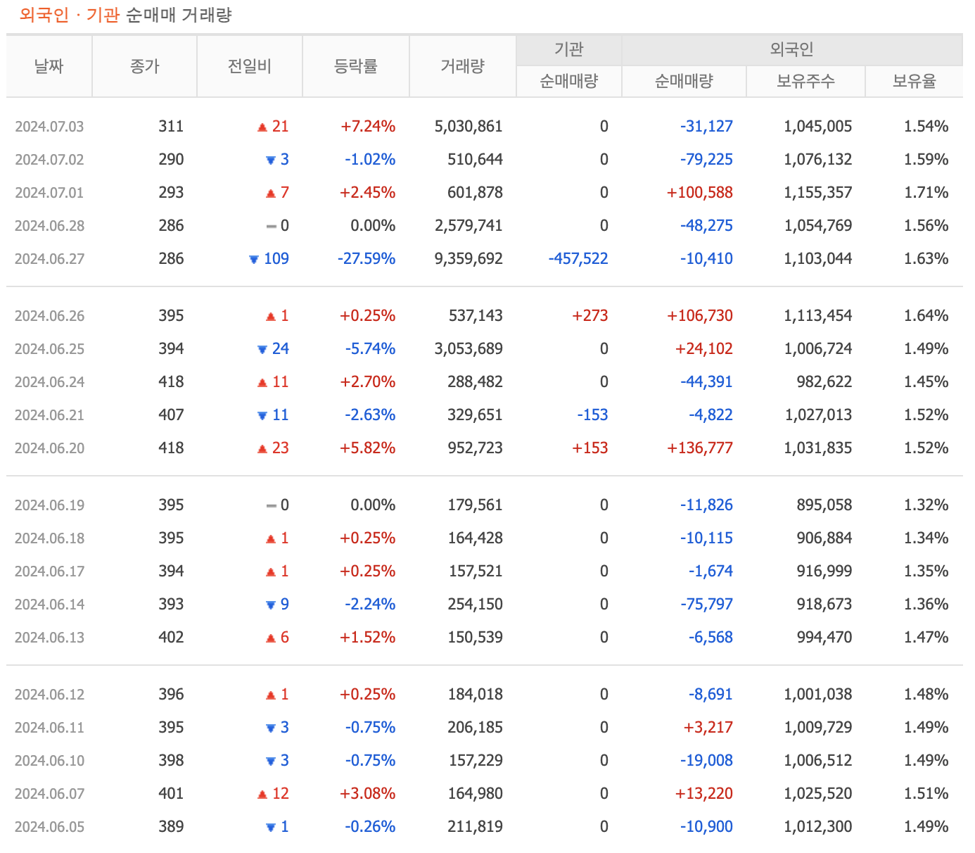 - 대규모 순매도: 2024년 6월 27일에 457,522주의 대규모 순매도를 기록했습니다.