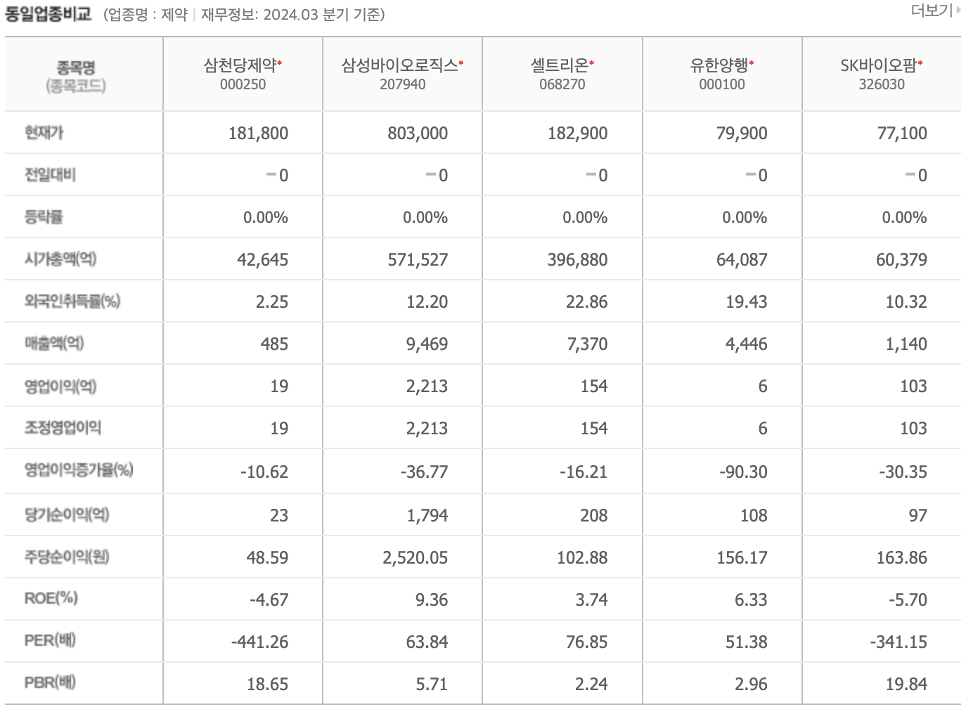 삼천당제약의 매출액은 485억 원으로, 비교 대상 기업들 중에서 가장 낮은 수준이다. 삼성바이오로직스(9,469억 원)와 셀트리온(7,370억 원)은 높은 매출을 기록하고 있다. 영업이익 측면에서도 삼천당제약은 19억 원으로 가장 낮으며, 삼성바이오로직스가 2,213억 원으로 압도적인 수치를 보인다.
