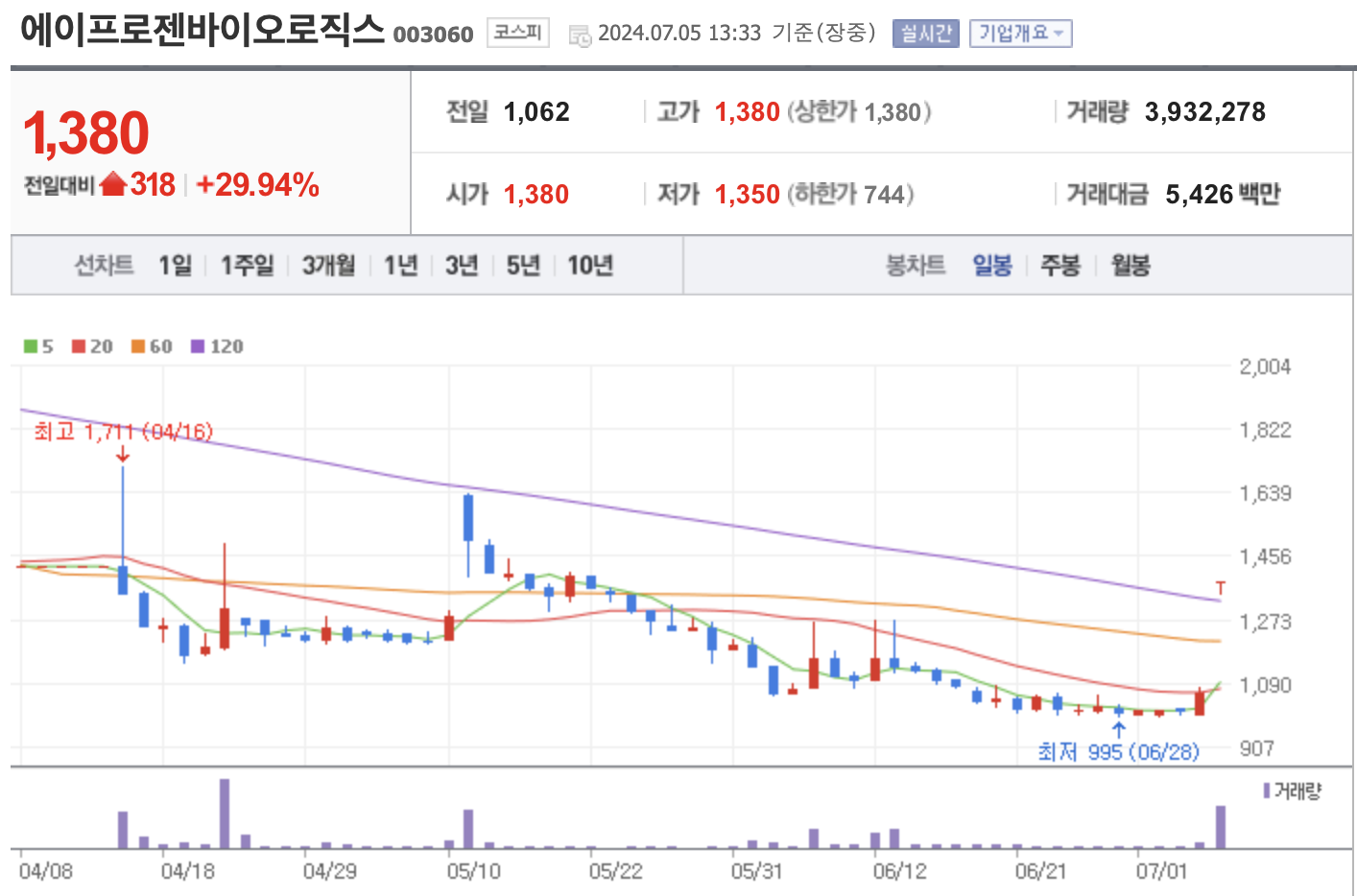 - 2024.07.05: 최대주주 1,000억 지원 소식에 상한가 기록
