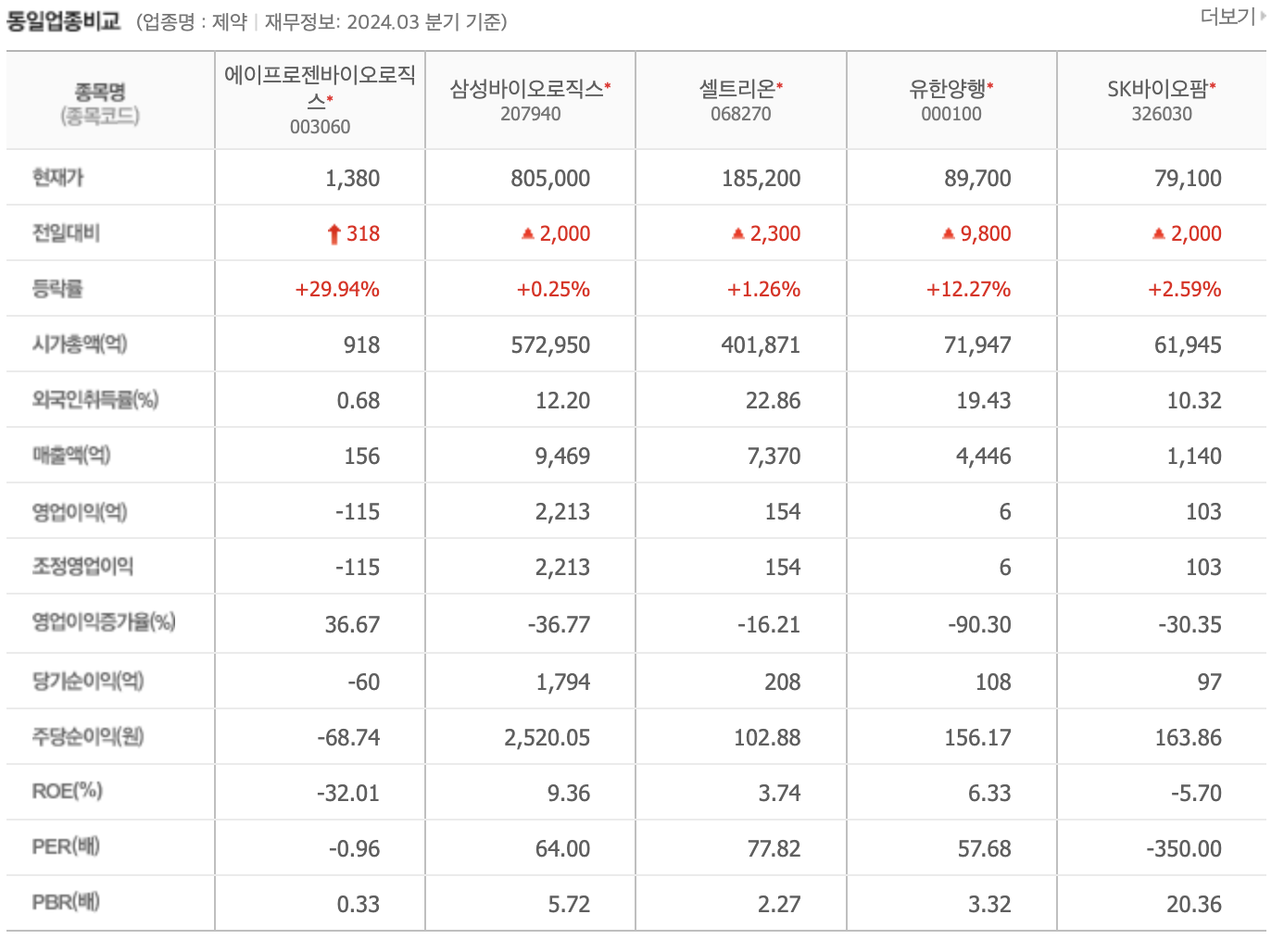 삼성바이오로직스와 셀트리온은 글로벌 바이오 의약품 시장에서 압도적인 규모와 매출액을 자랑하며, 높은 외국인 비율로 글로벌 투자자들의 신뢰를 받고 있습니다. 에이프로젠바이오로직스는 상대적으로 작은 규모를 가지고 있지만, 고부가가치 제품 개발과 같은 긍정적인 요인으로 성장 가능성이 큽니다.