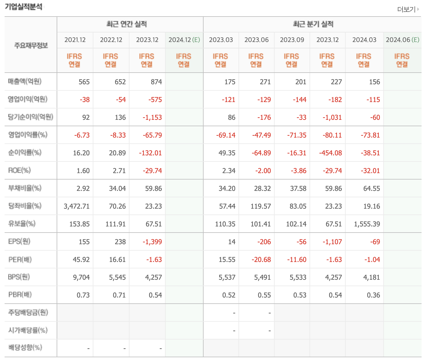 - 2020년에는 -26억 원의 영업손실을 기록했으며, 2021년에는 -38억 원으로 영업손실이 확대되었습니다. 2022년에는 -54억 원으로 영업손실이 더 커졌고, 2023년에는 -575억 원으로 영업손실이 크게 증가했습니다.