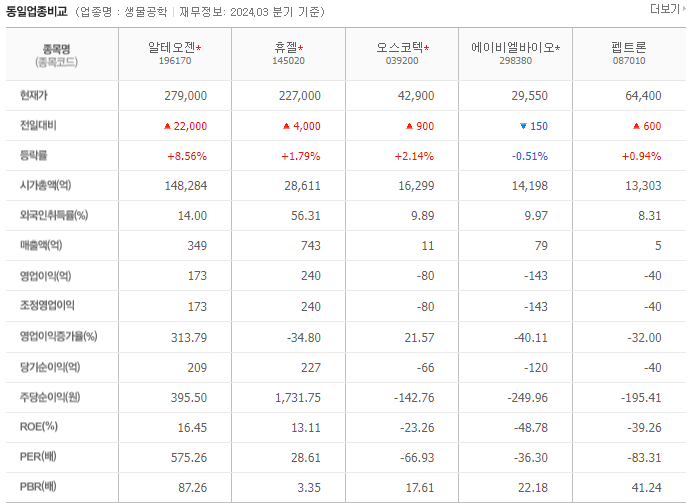 알테오젠(ALT)은 바이오제약 업계에서 경쟁사인 휴젤, 오스코텍, 에이비엘바이오와 비교할 때 다음과 같은 특징을 보입니다: