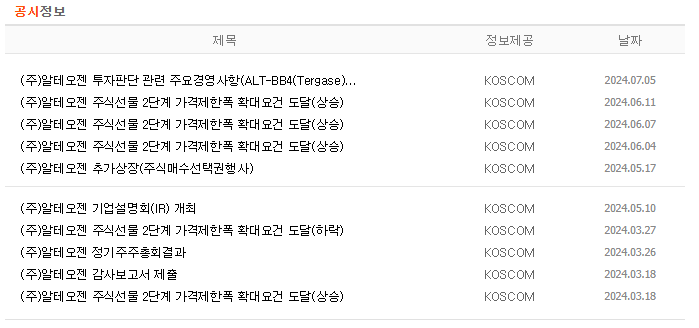 - 알테오젠 자회사 상장 계획 발표 (한국경제, 2024.07.04)