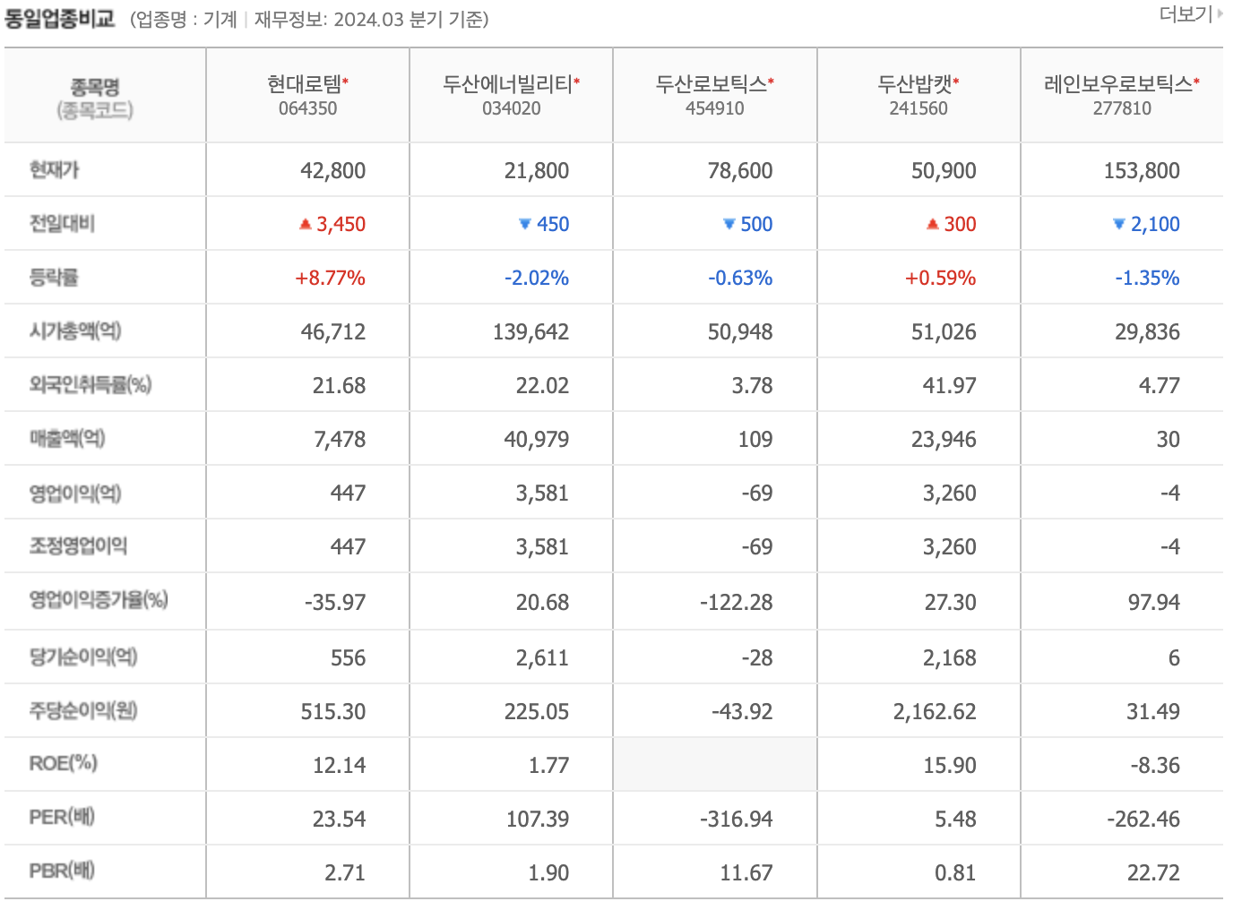 - 두산로보틱스: 로봇공학과 자동화 기술에서 두각을 나타내지만, 방산과 철도 차량 분야에서는 미흡합니다.
