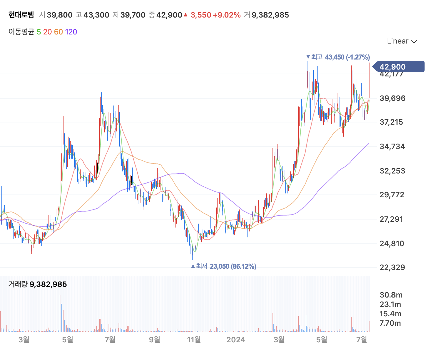- 현대로템의 주가는 최근 1년 동안 상승과 하락을 반복하며 변동성을 보였습니다. 특히, 올해 들어 주가는 상승세를 이어가고 있으며, 최근 43,450원을 최고가로 기록한 후 다소 조정을 받는 모습입니다.