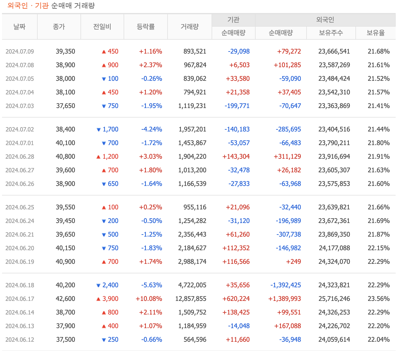 - 기관과 외국인의 거래량과 비교해 상대적으로 소량의 거래를 하고 있습니다